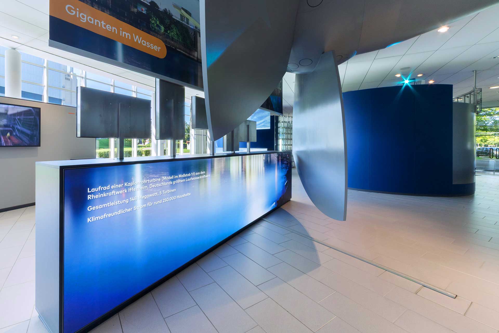 Die Themen – von der Kraftwerkshistorie über moderne Kraftstoffe und Dekarbonisierung bis hin zum Netzausbau – werden mit Multimedia-Elementen inszeniert und mit Video, Licht und Sound emotional aufgeladen. Ein Highlight ist ein 3D-Echtzeit-Spiel, in dem ein Energie-Blackout verhindert werden muss. Hand-on-Exponate machen Technik verständlich, während außergewöhnliche Real-Exponate wie eine Wasserkraftturbine Dimensionen erfassen lassen.